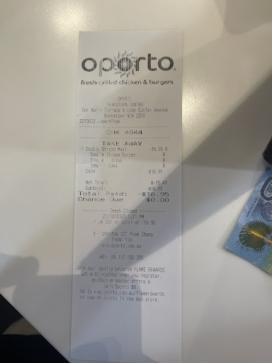 Read moreHonestly, I love Oportos and their service is great BUT after today, I am never having Oportos again because of the experience I had. I bought a single Bondi burger meal. As I was eating the burger, half way through, I took a bite that actually changed the whole experience. This bite, I kid you not, tasted like I had bitten into a live chicken or a chicken farm. The disgusting taste filled my mouth, and had me non-stop gagging needing to vomit. I literally got turned off and threw my whole meal out. I’m actually so disappointed in the quality of the chicken. Oportos was my go to place however, I’m never stepping foot in any...