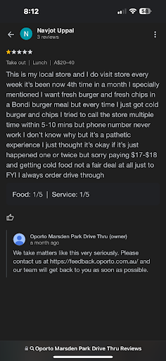 This is my local store and I do visit store every week itâs been now 4th time in a month I specially mentioned I want fresh burger and fresh chips in a Bondi burger meal but every time I just got cold burger and chips I tried to call the store multiple time within 5-10 mins but phone number never work I donât know why but itâs a pathetic experience I just thought itâs okay if itâs just happened one or twice but sorry paying $17-$18 and getting cold food not a fair deal at all just to FYI I always order drive through
