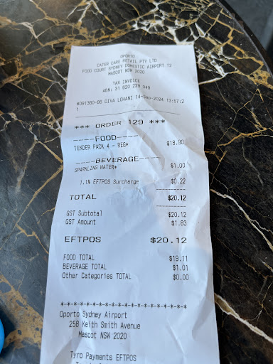Read moreI’m a regular OPORTO’s customer, since the first store back in Bondi, matter of fact.. also a loyal customer, and loyalty programme member. Today’s server was Diva Today’s service was sub-par, definitely not something I’m accustomed to with the OPORTO brand, OR the stores I regularly visit. Diva looked bored, her tone and manner were not warm or friendly. She looked like it was going about the motions, not consciously engaged or inviting. She proceeded to try and upsize me, without asking did I want to upsize. Her rudeness increased and she became frustrated with the transaction, moving off whilst I was stating that I’m a loyalty member. Her swift, dismissive response was that the airport does not support that loyalty program. Maybe so? You could at least offer an upsize? Maybe Diva was in a rush to knock off? Who knows? Either way I’m disappointed with the service here today, and will not return service or patronise this...