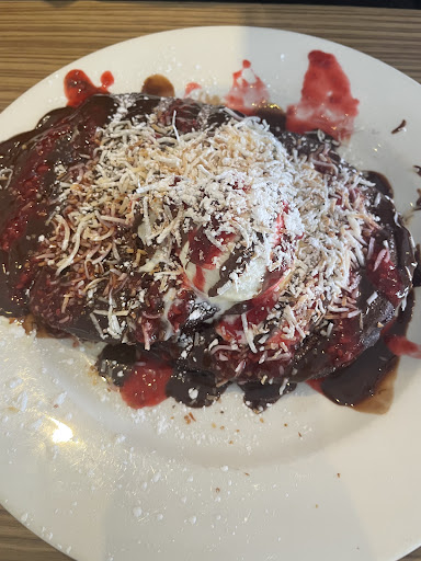Food. 3-4/5: The pancakes are a hit & worth the trip. Delicious! 👍 The savoury options are hit & miss. Honestly more misses than hits. Disappointing most of the time. The pizza options are quite good however. I thought the coffee was average, but still decent. You can't fault the genrousity of the portions. Amazing Chai.