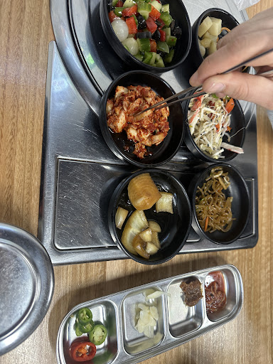 When we asked for a refill of side dishes, their gloved fingers were practically in the food, right after they had been handling used bowls and floor debris. The gloves were visibly stained orange, likely from kimchi residue, and were still being used to plate and serve clean dishes. This completely defeats the purpose of wearing gloves and was extremely off-putting.