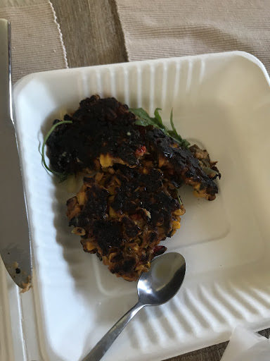 On Mother's Day, we decided to give them a 2nd chance and ordered there again in the hope that the experience and food would be better (especially if it wasn't trapped in cardboard containers for half an hour!) No issues on pickup this time but the 2 x corn fritters (for the two mums!) we ordered were so burnt they were not edible, see photos. We rang and they offered to replace them which meant I needed to waste at least another 20-25 mins driving back and forth while both mums had to sit around watching others eat their meals. Upon arriving, I received the most insincere apology when I asked how they could serve this to their customers. The response I received was 'it's Mother's Day, we're busy', to which I responded 'that's not really an acceptable reason'. I then rudely received the comment 'it's gonna have to be'.