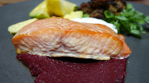 We were seated then perused the menu, interested to expand on our limited knowledge beyond an espresso, macchiaito, latte and cappuccino. With a plethora of choice, I went with the V60 pour over. This method involved the pouring the coffee over a grooved ceramic funnel like cup and filter paper. The barista, showing his skill, has this method down to a science weighing and timing the process, making for a nice tasting filter coffee. We also ordered a latte, a nice cup of coffee topped with some latte art, I was suitably impressed. Foodwise, there were many options that took out fancy such as the burgers or chicken and waffles and they also had a few healthier options which we went for on this day. We chose the brunch plate and the chicken and roasted cauliflower salad. The chicken cauliflower salad with chicpea, watercress and zucchini had fresh clean flavours. The Brunch plate was nicely presented with great ingredient combinations of smoked salmon, beetroot paste, avacado watercress as well as some falafel zucchini fritters, served with a lemon wedge and house made labne. We were impressed by the salmon which was house smoked with apple wood, the labne also made on site. The falafel had a crisp crust with a moist centre.