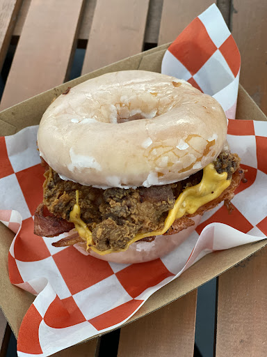 We also sampled a new burger thatâs about to drop. A crispy fried chicken burger, with bacon, cheese and Krispy Kreme original doughnut playing the part of the buns. An interesting combination of salty, sweet and crispy. Not sure of the price, but worth a taste if youâre an adventurous eater and like Krispy Kreme doughnuts.