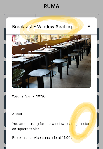 Ā Ā Ā Read morewe are really disappointed and appalled at the service of one staff member. Reservation was made a week ago, we've travelled 1.5hrs on public transportation on a rainy day for a birthday brunch at Ruma (yes silly, but we wanted to keep the plan we'd made despite the weather). Only to arrive & not have a table and directed to seating outside. Not wanting to deal with more rain as we were already wet, I asked what had happened with our reservation and they had to refer to 2 other staff members before the person who appeared to be in charge for that morning, Alejandra (unsure as to spelling) told us our reservation for "window seating" is outside and showed us it's the seats outside that are window seating, with a tone as if we were at wrong. I've included a screenshot of your website that clearly states window seating is INSIDE the restaurant. There was no apology or 'let me check', we were spoken to as if we've somehow done something wrong, like it was incredulous to ask about a reservation we had made and had even called to check in the morning to confirm. Is it too much to expect that if you made a reservation, you'd be shown to your table on arrival? To add to this we had even called the restaurant at 10am and confirmed with the person on the phone that it was indoors we booked because of the rain. She said quite annoyed to give her 5 mins to see what she can do to get us seats inside. This could suggest reservations aren't kept. Yet the entire time we were dining this staff member had reminded the tables around us of the 1.5hrs dining time limit suggesting reservations are prioritised.