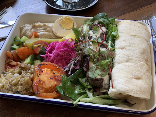 The coffee was quite ordinary so quite disappointing to me, but it was served quickly. The food was slow, we waited for about 40 minutes. The Kofta Beef with Salatim looked beautifully fresh. All the bits and pieces were very tasty, fresh and full of flavours with the exception of the roasted tomato, it needed more roasting time and not much flavours. The hummus was excellent but the beef kofta was too salty and overcooked, flavour was just ok. The flatbread although soft but disappointingly tasted quite bland.