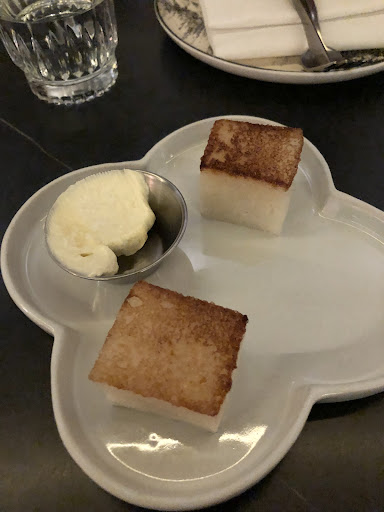 Anyway, for the food, we started with the complimentary rice bread with the anchovy butter and sea salt. Very different texture (sticky - like rice cakes), paired with the butter šš¼ - could have a few more of these. Next, we had the wagyu truffle tartlet ($15/piece) which was amazing as well - tartlet was made with dumpling skins and were thin and really crunchy. Tartare was so balanced from the sweetness of the pear.