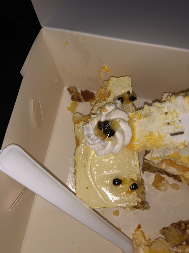 Out right rude service and off cake. I feel so sick now. (I bought a mud cake with ganache on top and then another mud cake with cream in it and on top then swap it for two passionfruit...