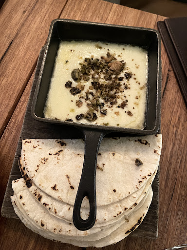 With a little at-table Tetris, we get our mezcals and our main and sides arranged so they fit onto our tiny table. Topped with tangy, lightly blistered guindillas (Spanish peppers) the Wagyu Picanha ($42) is the centrepiece. The rump cap has been beautifully cooked and rested, with its pink interior poking through the charry crust. Topped with a pat of garlic jalapeno butter, itâs a highbrow rendition of a common dish that Brazilians go crazy over. Punctuated with forays into crisp Grilled Broccolini ($10) dragged through pea mole with tequila dressing, the slices of wagyu are rich and well worth savouring. Crisp Brussels Sprouts ($10) dusted in pecorino thatâs glued on with lemon garlic dressing should help fill out any corners you didnât already stuff with cheese-laden tortillas.