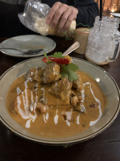 I had Massaman beef curry - so bad. The 1 1/2 of a potatoe was deep fried - no idea when. The beef was really over cooked to the point where it had a hard shell and I was pulling inedible pieces of beef out my mouth. Stringy dry beef with a hard crusty outside shell type taste.