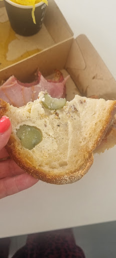 The pickles were packaged in a takeaway espresso cup inside the sandwich container and leaked pickle juice all over the sandwich making it soggy and disgusting, not that it would have been great in any case, since the bacon is barely cooked, and It's apparent that the sandwich was assembled while the bacon was still scalding hot, which wilted the lettuce into a gooey unappetising mayonnaisey, soggy mess that soaked into the bread.