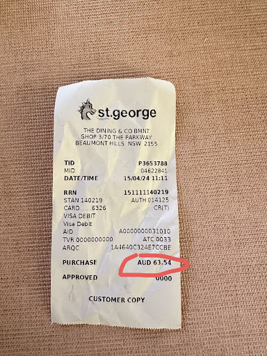 Ā Ā Ā Read moreToday's experience at The Dining and Co Beaumont Hills was extremely disappointing. I ordered prawn pasta and a kids meal chicken nuggets, totaling $37. After paying by card, the older Asian female owner did not provide a receipt or communicate with me. Sensing something was off, I requested a receipt. Upon returning to my table, I discovered she had charged my card $63.54!