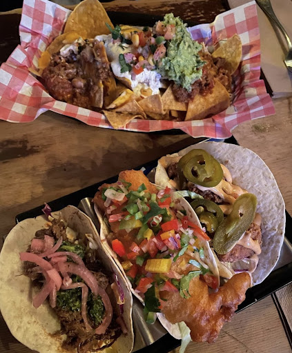 Beef Nachos & Three Tacos - Pulled Brisket with ranch slaw, chimichurri and pickled onions, Southern Fried Chicken with ranch slaw, chipotle mayo and jalapeños and Baja Fish with lettuce, citrus sour cream and pico di gallo. BEST brisket ever!