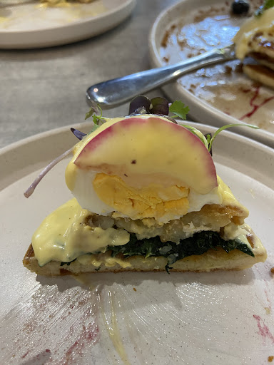 Came here for brunch. Not much people in the cafe when we arrived but a person before us ordered a lot of pizzas. Our food: eggs bene & the pancakes arrived 10-15mins later. Coffee served earlier was already cold. We just hungrily dived into our food. The pancakes were delish but the eggs Benedict was a bit disappointing- please see photo. We were all so hungry that we just ate. Hope you can spend equal time in preparing your food since it is included in the menu. The lunch crowd came - and there was this big group who in just a few minutes had their pizzas arriving. Sure, it was most likely an advance...