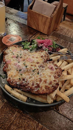 When we walked in the available tables were left dirty and uncleared, to the point that we went to the bar ourselves to ask for a cloth to clean the table. After ordering our food our drinks came out quite promptly, yet we waited around 30+ min for our food. The chicken Parmi came out first and actually tasted quite nice. The chicken wasn't dry, it had a good sauce balance and it came with fries and salad.