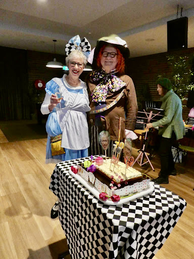 We had a Mad Hatters’ Tea Party theme and they allowed helium balloons on weights on the tables as well as Blu-tacked decorations on the windows, all of which we removed afterwards. The room also has its own good sized and staffed bar and is fully air conditioned and so was toasty warm on a very cold July day. There was also a stage, which we used for an impromptu performance by a group of 20 lady singing ukulele players among us who put on a 45 minute show just for our benefit. Given The Place is in a separate building to the main hotel we didn’t disturb the other patrons. We could use the PA system with a provided mic and also the projector for the mandatory photo show of the now 70 year olds, right back to their childhoods.