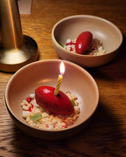 Raspberry Sorbet with milk crumb, buttermilk gel and puffed rice, a very light and tangy finish. love that this wasn't a heavy dessert, and appreciated the lil candle for my early bday celebration 🕯️