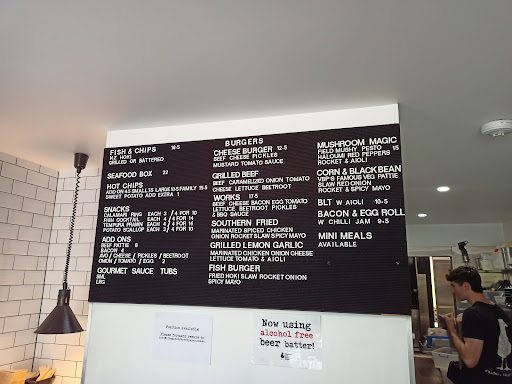 The birds take the opportunity to eyeball us through a string of Edison bulbs draped along the edge of the white, bull-nosed corrugated iron roof. It provides a little shelter for five stools set along an L-shaped wooden benchtop. It's nothing flash, but a nice enough place to enjoy a casual meal by the sea. Inside, the clean, white-tiled and simply appointed store is dominated by a stainless-steel counter. Behind it sits a retro white-on-black letterboard outlining the regular menu, with today’s printed specials hanging on white paper below.