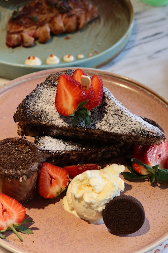 oreo french toast ($20) š they oreocrumbed the fluffy brioche w the oreo filling inside š®āšØ goes well w the ice cream and strawberries š¤