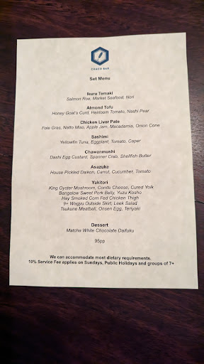 Read moreWe came here to try $85 Tasting menu which start off with the entree of the Chaco Classic of Fig Shiraae, Salmon Namasu, Warayaki Wagyu Yukke/ Grilled Eel. You eat from the heaviest Wagyu Yukke in flavours to the lightest which end with Fig Shiraae to cleanse the palate before you move to their Chawanmushi. The Chawanmushi were served with It's Shell butter top with Blue Swimmer Crab. It was creamy, buttery and eggy egg custard with the meaty crab meat was one of the highlight for the night.