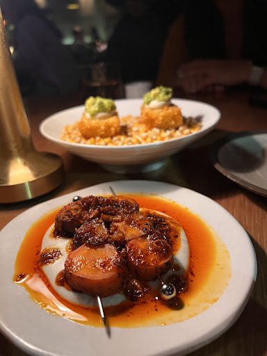 BBQ Broccolini had a nice charred flavor and possibly some mustard seeds in the sauce, one of the better items. Artichoke Tart lacked flavor and texture, leaving us unsure of its intended highlight. Corn-based item with avocado was unidentified but tasted pleasant with a slight sourness that added a nice touch. Buckwheat tortilla with mushrooms was not served, despite being charged.