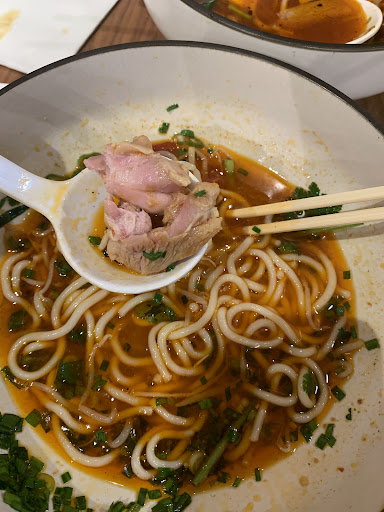 We came here for dinner last Thursday, and ordered the pork noodle special and the Spicy Mala Chicken Rice Noodle. The pork soup base was phenomenal, better than the chicken rice noodle soup. Especially because after several bites of the chicken I realised the chicken was RAW and not fully cooked. When I showed and told the waitress that I didnāt think the chicken was edible, she went back into the kitchen and returned saying the chef said the chicken was pink because it had been pickled⦠We pointed out that some of the other chicken in the dish was not that same colour⦠and I asked to speak to the chef. At this point the waitress returned and offered us a refund. This is quite alarming considering I could have had salmonella food poisoning. If you come to eat here please check the chicken. I understand people can make mistakes but I am very unhappy that the kitchen lied to me. It was very busy on Thursday night and my soup was brought out extremely fastā¦