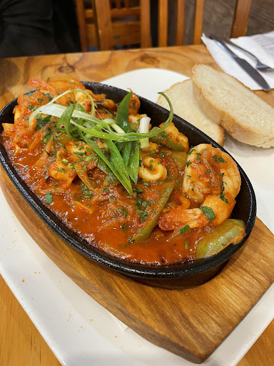 Sizzling Diablo, with fresh calamari, fresh prawns, sautéed capsicum, chilli, garlic, onion in a red wine and napolitana sauce and home made bread.
