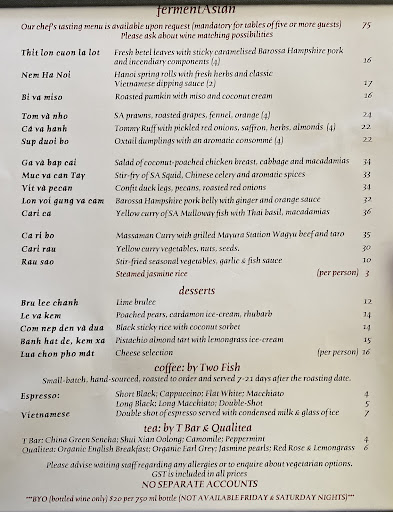 We have dined at Fermentasian 6 times now. After being so impressed by the flavour balance and overall quality and presentation of the dishes during our first visit, and being lovers of the Vietnamese cuisine, Fermentasian became our absolute must do dining experience when staying in the Barossa. We have recommended this restaurant to countless friends and anyone that was going to the Barossa for many years now. It was always very highly regarded and we rated it 5/5. Every single time it was consistently excellent. For me to say this doesn't come easy - I am a keen cook and with a very well tuned palate for flavour, a lot of dining experiences don't get my accolades. Fermentasian repeatedly did. We stayed for a few nights last week and booked for lunch on Friday, very much looking forward to it, as we hadn't been for 3 years with covid etc.