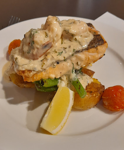 I ordered one of the specials, Crispy Skinned Salmon with baked Chat potatoes, grilled brocollini and prawns, with a garlic, lemon and dill cream sauce.