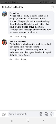 Read moreDont ever go to the Exeter Pub if visiting the area!! Theu are unprofessional and untruthful. Their facebook page stated they were open until 9pm. We got there at 7 and and they locked the door and said tills were closed even though people were still in side. Then when i posted a review on facebook tried to say mum and i were inebriated!!! We hadnt even had a drink and mum was driving!! I could understand if they came back with sorry we will look into the advertised hours but we have always closed at that time...i would have been ok with that answer, but to try and say we were...