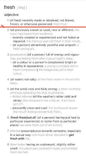 Ordering was simple enough. The staff confirmed that the fish was âfresh, yet all of it comes frozen.â Their understanding of fresh is obviously confused to the dictionary meaning.
