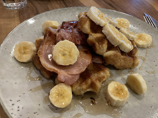 I really wasnāt expecting much, but left feeling completely satisfied and š happy! I ordered the waffles with bacon (seriously try it!) and banana slices on top with delicious maple syrup. I couldnāt finish my big serving and couldnāt help making a little moan of delight with each mouthful. Excellent friendly service and mum loved her handmade scallop pie. I was so ful but the desserts looked so yummy I took a couple home instead of dinner, I donāt get out that often but have tried the local cafes and this deserved its 5 stars....