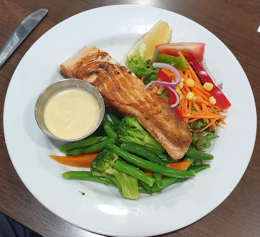 Top notch Bistro with really lovely blackboard specials. There were so many tempting things, but I was a good boy!! I had salmon steak with skin on $27 with fresh veggies and a lovely golden creamy light sauce, fresh salad with light dressing. It was advertised with chips and salad, but they had no problem changing it for me. The presentation was beautiful it was piping hot, and it was tasty - a tribute to the chef! The drinks here are really cheap - $3.80 for a sparkling mineral water!! There needs to be more people coming here! The girls are friendly and helpful and nothing is a problem for them it's a lovely club!...