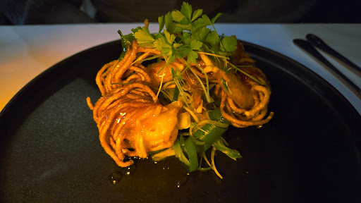 Sadly, the service was uninspiring too. It was efficient, but cold and felt subtly unfriendly. We didn't feel welcome. To the contrary, we felt we were an imposition. Plus, even though my wife booked a month ago, we were given a table right near the front door, desk and reverse-cycle air-conditioning. And the AC was blowing cold air all over us. I don't suffer much from the cold, but I had to go back to the car to get my jacket, and even though I ran back and put my jacket on, I was still cold under the AC. Freezing. I was so uncomfortable, it was all I could think about. Eventually, I said something about it, and the waitress said she'd turned the temp down because it was stuffy, but she would turn it back up. I said I don't want to make everyone else suffer, and was happy to take another table (no window tables left), but she said no, it was probably just her. She then turned the temperature up, and I was no longer cold, so when she came back to the table, I thanked her, and she repeated that it was probably just her. This was nothing terrible, but it's subtly unwelcoming. She positioned the issue as a question of her comfort or mine, so I spent the rest of the night feeling guilty that she was now uncomfortable.