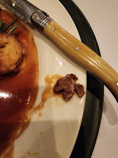 When I enquired as to whether the eye fillet was supposed to be that tough to chew and have so many veins, the waitress wasn't sure. After asking the chef the response came back as there is nothing the chef can do about it, and that this is just how the eye fillet is. The chef also advises even if he does another piece, it will be the same. The fact I was handed back my plate shows they refuse to redo it or offer me a different dish.