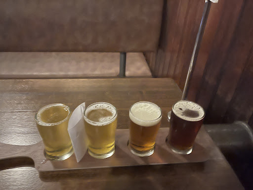 "The Brewery". Restaurant,and Function centre, is located in the former city post office (circa 1897). A heritage land mark in the CBD, it incorporates the only functional clock tower in Townsville. Inside, dark tones predominate, creating an elegant, moody atmosphere, highlighted by a pale tongue and groove ceiling hung with fabulous art deco lamps. Patchwork style art deco glass windows, and a huge decorative gilt mirror, add further interest. Half the restaurant has large comfortable booth seats and tables, the other half, stylish wooden tables and chairs, and delicate, filmy curtains separate the two areas. One high stretch of wall has been pared back to the original brickwork revealing the Brewery's historic past, and a large window allows views into the actual brewery. A beautiful horse-shoe shaped alcove with soft lamps and a magnificent chandelier is tucked away at the rear. We tasted seven of the brewery's boutique beers, Townsville bitter premium,Townsville lager, Bandito loco Mexican lager, Belgium blond wit bier, Digger's golden ale, Ned's red ale, and a Flannigan's dry Irish stout, all noteworthy, accompanied by a dozen "Moulting Bay" Tasmanian oysters, au naturale. Our mains were, Eye fillet (250g) Kimberley red beef, grain fed, (Moranbar Queensland), served with pan fried prawns, cafe de paris butter, roasted vegetables, and a Pan seared Atlantic Salmon on pumpkin gallete with grilled field mushrooms, green beans, and salsa verde. All beautifully prepared and presented and thoroughly enjoyed. Espresso and hazelnut profiteroles with chocolate sauce and an individual caramelised lemon tart with double cream, completed our dinner, finishing with a well made coffee. A very enjoyable evening. Upstairs, a very large function room is available for, weddings, conferences, etc.The furnishings and light fittings...