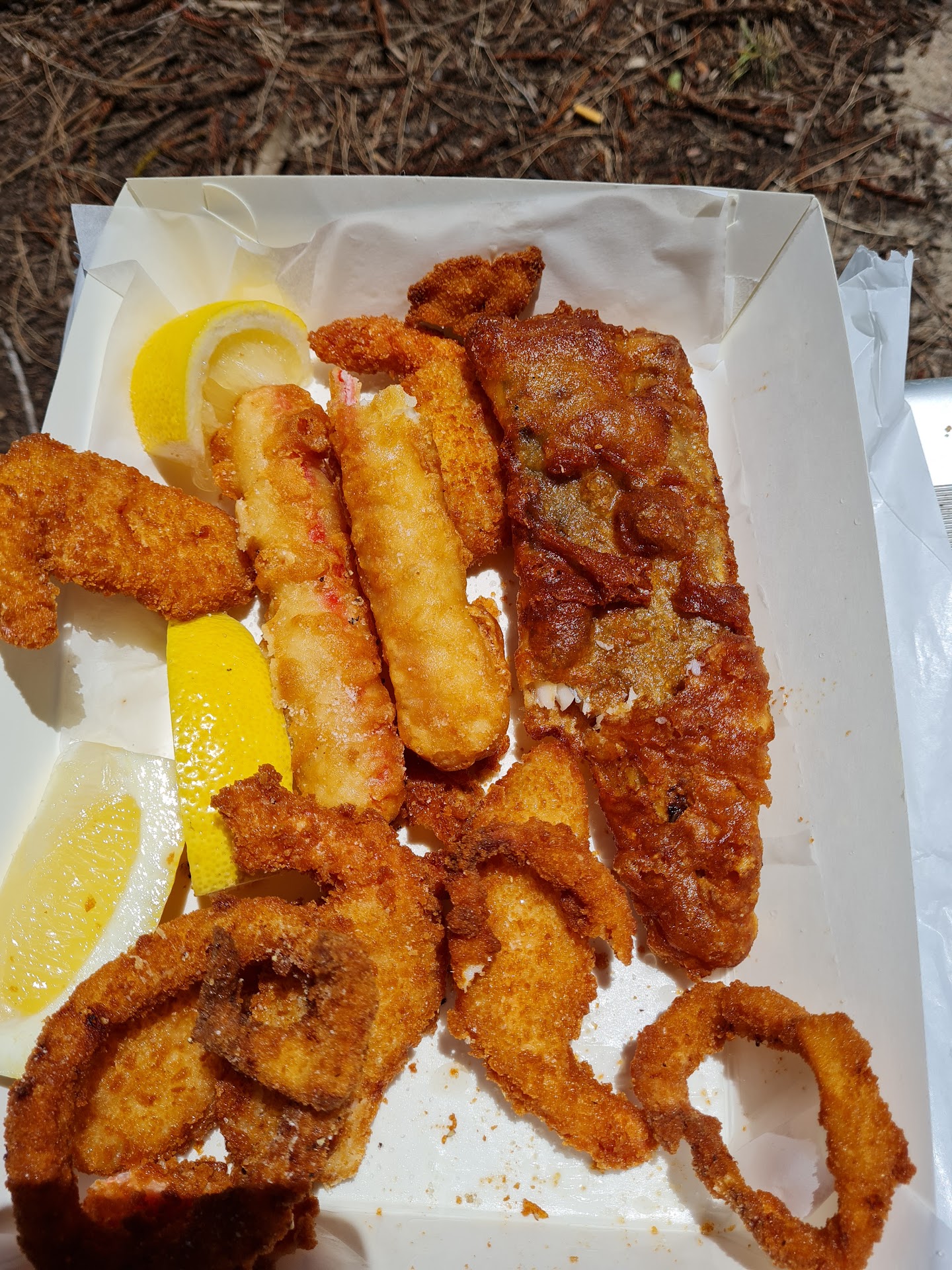 Read moreWe rarely get take away but being on holidays decided that fish and chips on the water would be a great dinner. It worked out just over $100 (which for our big family wasn't too bad). We waited about 20 minutes, which was fine. We left and opened the bag and the fish was dark brown and shiny from the oil. The calamari rings were soggy and broken with black bits, I assume came from the fryer covering them. The chips and scallops were just about edible, so I called and asked if we could replace the fish and calamari as it was inedible. They said the problem was that the oil needed changing and they could remake it and let it drain for longer. The food came out looking exactly the same, this time with a dead and squished fly on the bag. Not sure if he was put in as an extra for our trouble but I was quite happy without him! So we ended up spending $100 on a bag of chips and threw the rest in the bin. So...