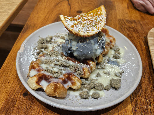 Venue: first time to dine in after renovation. Same Causal setting. Nice simple decoration. Small tables. No comfy seats. A bit dirty. Choatic kitchen. Also, selling flowers (displayed on the shelf at the entrance). --- 6/10 Service: very busy during dessert time. But, they were not busy this visit (7pm weekday). Get a menu at the entrance (hanging on the interior door frame). Order and pay at the front desk. Get tap water, serveitte, and utensil at the self-service table next to the front desk or next to the toilet. Choatic kitchen. One kitchen girl didn't listen to her colleagues at first and insisted on giving my order to another customer who had already told her that wasn't his order twice. Finally, she knew that. She was embarrassed because she knew that I was looking at her from my seat. Needed to wait for drink and food served together. The food tray was small for 2 drinks and 2 desserts. Why didn't she separate them into 2 trays? As she tried to squeeze all stuff into 1 small tray, she tilted the coffee cup and poured some coffee. --- 6/10 Food & drinks: normal presentation. Normal portion. Acceptable price, some items was slightly higher than other cafés. Prefer Bingsu next visit Cappuccino: beautiful coffee art. But served dirty. Taste ok. Portion was normal. Croffle with Black Sesame Ice cream, $14.9: served with homemade almost meal crumbs and a dried orange slice. Enough sweet dressing. Croffle was soft. The orange slice was not so attractive. --- 7/10 Hojicha Pudding, $ 7: told no matcha flavor. But, it looked and tasted more like Matcha. Small portion of pudding. The Chantilly cream on the top was silky, airy, and sweet. Also, served with roasted Almond and Adzuki bean paste. The pudding was not so outstanding. --- 6/10 ----‐------- 5/2021---3.5-4 stars. Busy place. Not enough menus for too many people. Beverage was served fast. Discovered self help service area myself. Waffles have to be waited a bit, but acceptable. Rice waffles were crispy at the edge, but chewy in the middle, texture and taste was unique. But the worst was insufficient maple syrup. It's mixed seeds. Normal portion of chocolate and...