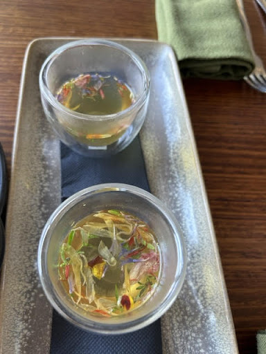 When seated, we asked the waitress what was included in the chef's selection that evening, to which she was unaware; she took our drink order and then left to discuss this with the kitchen. Upon her return, she advised that this was usually a 'surprise.' We opted for this and requested that there be no seafood. The waitress said we could keep the menu at the table to follow along with the meals as they came out.