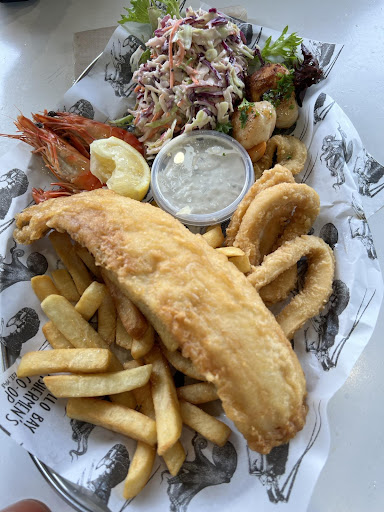 Read moreLooking at some of the reviews we were excited to get some " fresh seafood". After all this place is a Fishermans Co-op and located right next to the harbor...should be awesome right..quite a few 5 star reviews.. Well not so much. We arrived @ 6:00. An hour before closing. Seating was limited but grabbed the only 2 seats available. Tried the fresh shucked oysters. They came out in about 5 minutes. Tiny little oysters. They did not seem freshly shucked. Kind of fishy tasting. Would not order them again. Tried the seafood platter. Fried fish was okay. Not going to be memorable. Some of the fish was " fishy" leading me to believe it was not fresh. It should be at least we thought. Calamari was not fresh, like it was pre- cooked and held under a heat lamp. Kind of dry. No flavor.. Scallops were tiny, about the size of a fingernail. Again, warm at best and not that good. Prawns, seemed old. They were big but that's about it. Chips were good. The best part of the meal was probably the coleslaw. Just not the great seafood meal I think we were expecting. A bit...