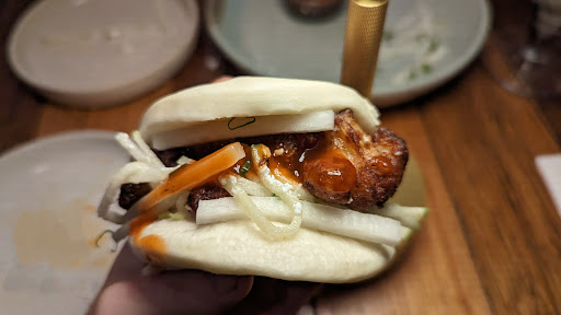 Came on a weekday night and they were not super busy and the ambience was lovely. We went with the feed me menu (which give you a small bite of quite a few dishes, great for exploring) and unfortunately I found it slightly lacklustre. The cured fish was fresh, but overpowered by the strong soy sauce flavour coming from fish eggs? The potato tart was oddly bland but with a weird bĂŠchamel taste. An unexpected bite to say the least. The fried cauliflower in baos were slightly underseasoned inside as well. The fried eggplant was lovely. Shaved wagyu was outstanding, and credit where itâs due, cooked perfectly and lovely and tangy.