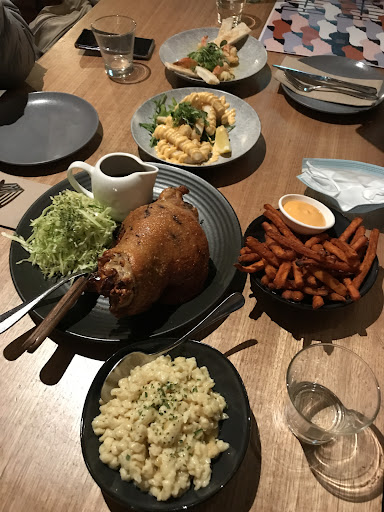 We ordered and the food came out very fast in 15-20 minutes. I found the portions to be quite small but it wasn’t a big deal as we ordered more food. The calamari and prawn entrees were cooked perfectly and delicious. The sweet potato fries were really amazing and definitely the best I’ve had. The pork hock was also tender, juicy and the skin was so crispy however the sauce that went with it was lacklustre. It was too thin for my liking and in my opinion needed to be reduced a bit more to get a thicker/ more viscous sauce. All the dishes were good however could be elevated even further with better sauces. For example the schnitzel was good but instead of serving it with spicy aioli it could be served with a delicious brown gravy. Just my opinion. For dessert we had the spice chai panacotta with poached pear and lemon tart. Panacotta was not bad, I could tell they used agar agar instead of gelatin to make it vegetarian so it wasn’t quite as “bouncy” as the traditional panacotta. The rum poached pear on the side was really great though, it was the highlight of the dish. The lemon tart was also not too bad, love that for both desserts you could have the option of having ice cream on the side.