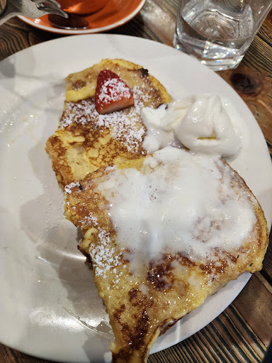 The French toast, if I may call that, came with two slightly densed toast lacking in flavour, overly sweet and paired with HALF of one strawberry . HALF. The ice cream, as you can see from the picture, is mostly if not all melted , leaving a puddle of cream on one of the toast. The puddle of good paired with cold maple syrup on a dense toast, would not what I would call even slightly decent. Maybe they should change the description of their French Toast on their menu, for better clarity of what patrons can expect.