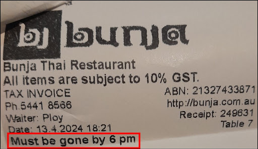 Upon paying the bill, I noticed that the receipt (refer to red box in the attached pic) had a message in bold stating 'Must be gone by 6pm'. This meant that somehow they expected our family (with two young children) to be finished eating within 15 minutes of the staff member telling us the table was 'reserved' even though they hadn't even served our meals.