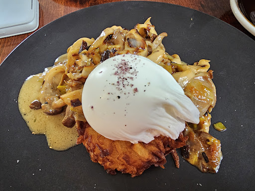 This little cafe was nearly full by the time we got our food, and we arrived at 12:30pm on a Friday. The one maitreād (assisted by a barista) was fully stretched. The atmosphere was eat-quickly-and-leave. My friend joined me and looked doubtful āwhat made you choose this place?ā. I was starting to doubt myself, having been brought here by a BEAUTIFUL instagram account and a story of all-house-made dishes - down to the flat bread. They had me at house-made flat bread (I must write a review of Our Lady of St Kilda sometime, where i first encountered house-made pita bread - a life changing experience). This version was not pita, it was almost a squat, pan-fried leavened bread, but it was marvellous, and was paired so beautifully with the accompaniments. I tried a bite of my friendās lamb on a bed of hummus and topped with pomegranate and oven roasted chickpeas - and I knew Iād been right to come here. The Turkish eggs were superb. If the vibe lacks tranquility, the hidden magician producing the food more than makes up for it. We also tried a pistachio cookie (complete with viral kataifi) and a slice of carrot cake - all made by the same magician and both MAGIC. (Skip the hot chocolate, as it clearly lacked heart - and, tellingly, is omitted from their beautiful instagram feed)....