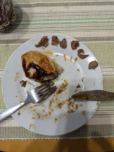 Lovely staff in a warm and clean environment but unfortunately that was where my nice experience ended. After biting into my steak and cheese pie and finding quite a big piece of gristle, the bad experience continued with several more pieces of gristle encountered (as shown in the photo) which was very disappointing. Why would Daniel's risk their brand and the lovely flavour of their pies by using sub-standard meat.?I am not sure that you could use the label of 'steak' for the pie I ate - more like other cheaper cuts to me! Come on Daniel's lift your game! (Nothing against the Shepparton staff as their are only selling the products...