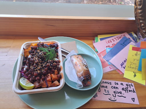 A true hidden gem! They offer a huge selection of plant based breakfasts, sandwiches, creative salads and desserts. Generally vegan, some come with egg, there are no meat replacements used. I had really hard times deciding because it all just looked amazing. In the end I had the gipsy salad, the BBQ-tofu roll, the hazelnut slice, a Ferrero cup and coffee (yes, I went there 2 days in a row cause it was so good). Huge portions and very fair prices. They also sell small local crafts and international sweets/chocolate known for their ethical production and sustainability like true gum or Tony chocolony. No outdoor seating. I liked the affirmation mirror a lot. Staff was very knowledgeable about the offered food and incredibly friendly. This small cafe is plant-based heaven. Don't hesitate, try...