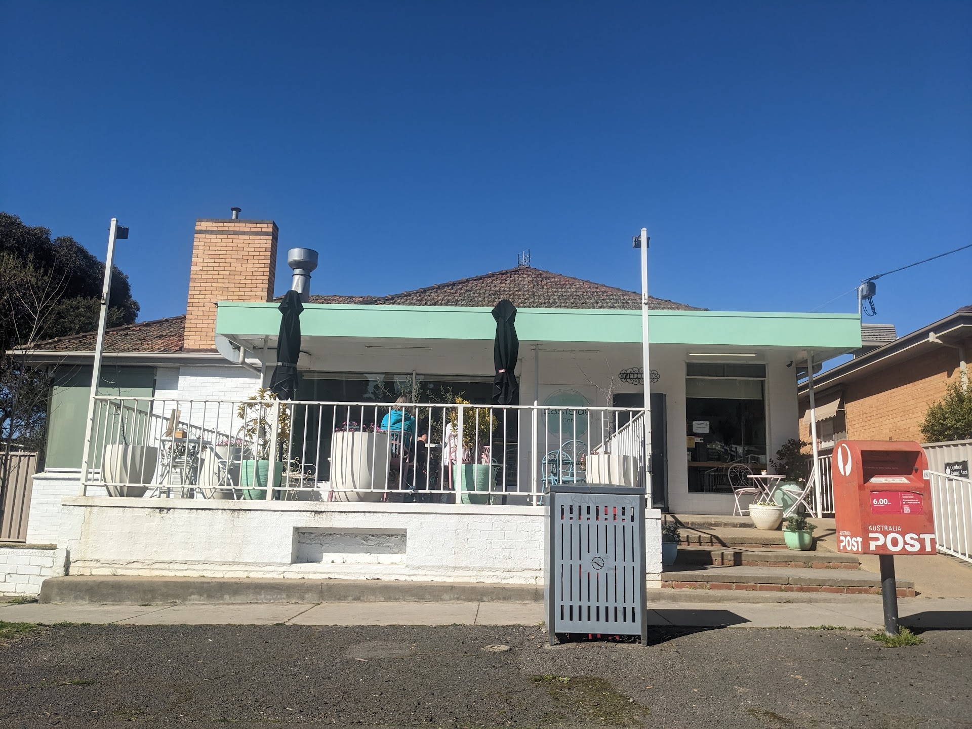 Lovely little cafe, obviously originally a house, then perhaps a milk bar of soughts as there's a bin a post box and a phone booth out front. Service was good, they don't do a brewed wet chai which was disappointing, and there's no fuss about latte art...fine with me. The coffee was ok, not great... alittle bitter, dark around edges, so I wonder if it's running a touch slow. The front porch is lovely, room to move and plenty of parking out front. Overall really sweet cafe in a mostly...
