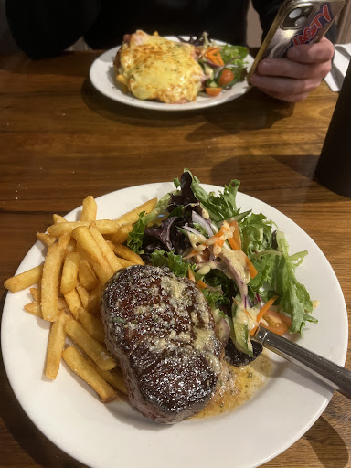 Our entree arrived and we ordered the cheesy garlic bread. It was really soft and so delicious. I ordered a medium rare steak and my partner ordered the parma for our mains. They came out quite quickly and were presented beautifully. My steak was really good, slightly overcooked for my liking but was still super tasty. The chips on both dishes were hot and crunchy.