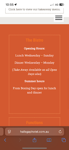 Read moreWe pre-booked as we went for dinner on Grand Final Day/Saturday and I’m glad we did as it was booked out! Despite this, there were still car parks and the restaurant was full but didn’t feel crowded. Menu has something for everyone (quite a few GF options as well as tasty vegetarian options) and there were lots of really tasty options that you wouldn’t normally find on a country pub menu! The kids menu has something other than just fried food! And our daughter’s chicken nuggets came with lightly blanched and buttery vege that were delicious! Hubby and I both ordered parmas but were hungry after a big day at the Halls Gap Zoo and swim at the Lakeside Caravan Park wood fired outdoor pool, so also ordered the bang bang cauliflower and chef’s special kingfish sashimi for entrees. The meals came out quickly and were perfectly cooked! The parmas had peashoot salads that weren’t over-dressed and thinly grated apple instead of dripping in salad dressing and red onion piled high, like a lot of other pubs. Staff were friendly and attentive and after our 7 year old finished her colouring in sheet, the waitress was quick to hang it up next to the playroom so our daughter could look upon it proudly. The playroom has a little playground that is appropriate for ages for 5 and under, but has glass walls if you have a restless kiddo that you want to keep an eye on, like we do! Central fireplace contributed to the cosy atmosphere. There is outdoor seating with a basket of blankets, but we’ll have to try...